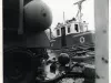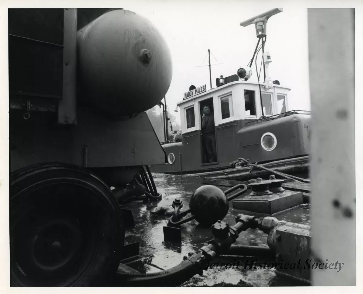 One black and white photograph of the work operations for laying an underwater telephone cable across the Trenton Channel of the lower Detroit River. A Dunbar & Sullivan Dredging Company barge is visible in the foreground. The tugboat, Paddy Miles, is tied alongside the barge in the background. A crewmember is standing in the doorway to the bridge.