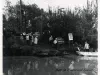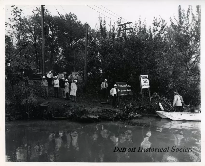 One black and white photograph of the work operations for laying an underwater telephone cable across the Trenton Channel of the lower Detroit River. A large group of Michigan Bell Telephone Company engineers and workmen (wearing hardhats) are standing on the treed shoreline in the foreground. A small runabout with two workmen and a diver can be seen at the far right side of the photo. Two signs mark the location of an existing submarine cable. Several parked vehicles, onlookers, and a house can be seen in the far background.