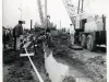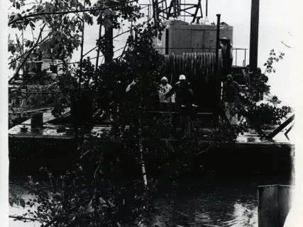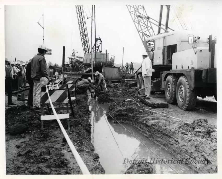 One black and white photograph of an underwater telephone cable being laid into a utility trench on the Trenton shoreline. The photo shows a crane and workmen who are lowering and guiding the cable into an open trench in the foreground. A large number of Michigan Bell Telephone Company officials, who are wearing hardhats, are standing at the left side of the photo. A barge with a crane and cable reel are visible at the edge of the shoreline in the center background. The bow and bridge of the tugboat, Sachem, of the Dunbar & Sullivan Dredging Company, can be seen behind the barge.
