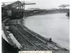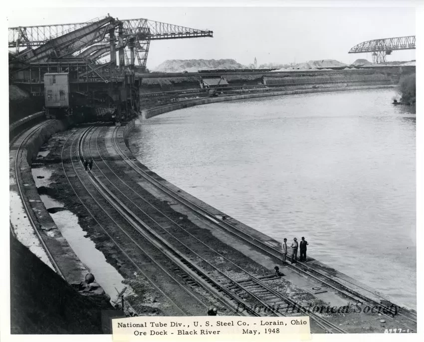 One black and white photograph (and one copy) of a new ore dock at the National Tube Company division of the U. S. Steel Corporation in Lorain, Ohio. The elevated view looks along the shoreline of the Black River and shows the new dock in the foreground with an existing dock in the background. Four Hulett unloaders can be seen near the upper left corner area of the photo. Large iron ore and limestone piles are visible in the far background. The ore dock work was completed by the Merritt-Chapman & Scott Corporation. A typewritten label along the lower edge of the photo reads "National Tube Div., U.S. Steel Co. - Lorain, Ohio. Ore Dock - Black River; May, 1947."