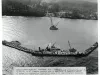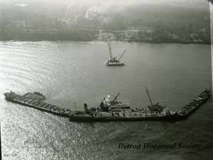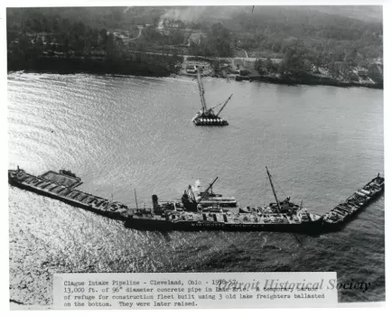One black and white photograph showing an aerial view of three small bulk carrier steamships that are anchored offshore along with a barge and two crane barges. The bulk carriers appear to be filled with sand or aggregate which might be intended for the construction of a water intake structure. A third crane barge is moored at the end of a pier and is carrying sections of large diameter pipe on deck. More pipe sections and supplies can be seen on shore in the background. The bulk carrier in the center foreground has the name, "Wyandotte Chemicals," shown in white letters on the side. A typewritten label along the lower edge reads "Clague Intake Pipeline - Cleveland, Ohio - 1956-57. 13,000 ft. of 96" diameter concrete pipe in Lake Erie. A temporary harbor of refuge for construction fleet built using 3 old lake freighters ballasted on the bottom. They were later raised." The construction work was done by the Merritt-Chapman & Scott Corporation.