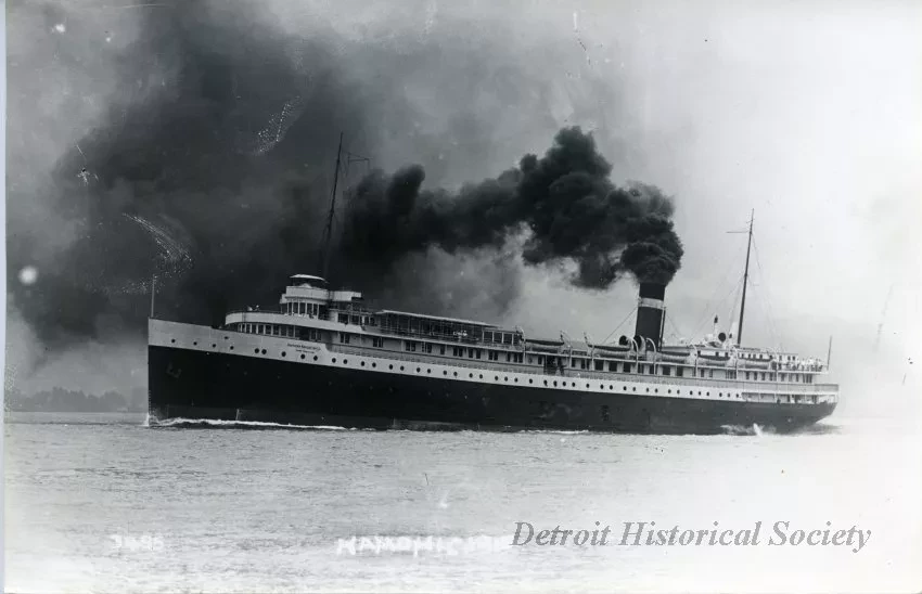 Photograph (and 1 copy). Black and white photo of the port side of the passenger steamer, "Hamonic," while underway. The ship was built in Collingwood, Ontario, in 1909 and was destroyed by fire on July 17, 1945, at Point Edward, Ontario. The ship was owned by the Northern Navigation Company which later became a division of Canada Steamship Lines. A typewritten label on the verso shows "Hamonic, Pass. Steamer, Northern Navigation Co., 365' - 50' - 24'. Built at Collingwood, Ont., 1909. Ran between Detroit, Sarnia, and Lake Superior. Destroyed by fire July 17th 1945 at Point Edward, Sarnia, Ontario." Printed text along the bottom of the photo shows "3485, Hamonic, 1915, Pesha Photo."