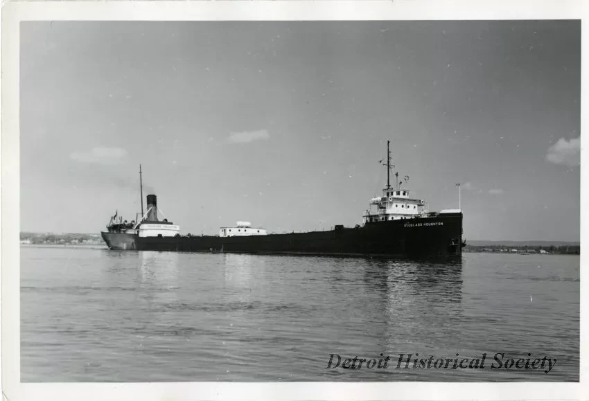 Black and white photo of the freighter DOUGLASS HOUGHTON, as taken off of its starboard bow. A shoreline dotted with small buildings and trees is visible in the background.