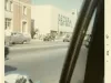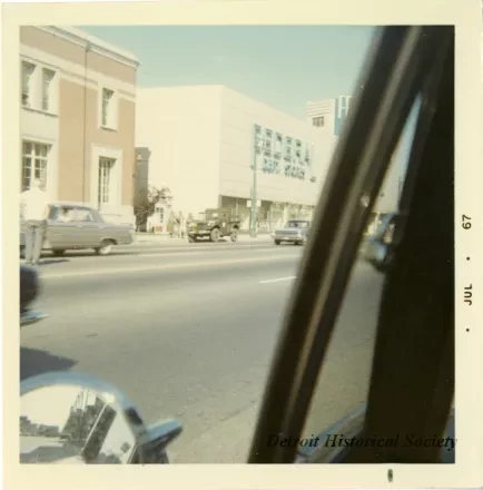 Color photograph taken in the aftermath of the 1967 riots of three uniformed National Guardsmen standing on the sidewalk beside their parked truck near a phone booth on the southwest side of Grand River Avenue east of Greenfield Road, as taken through the driver's side window of the photographers car. A Federal Department Store stands to the east of the troops, and a Michigan Bell Telephone Company building is to their west. "Jul 67," is printed in the right border of the photo.
