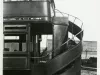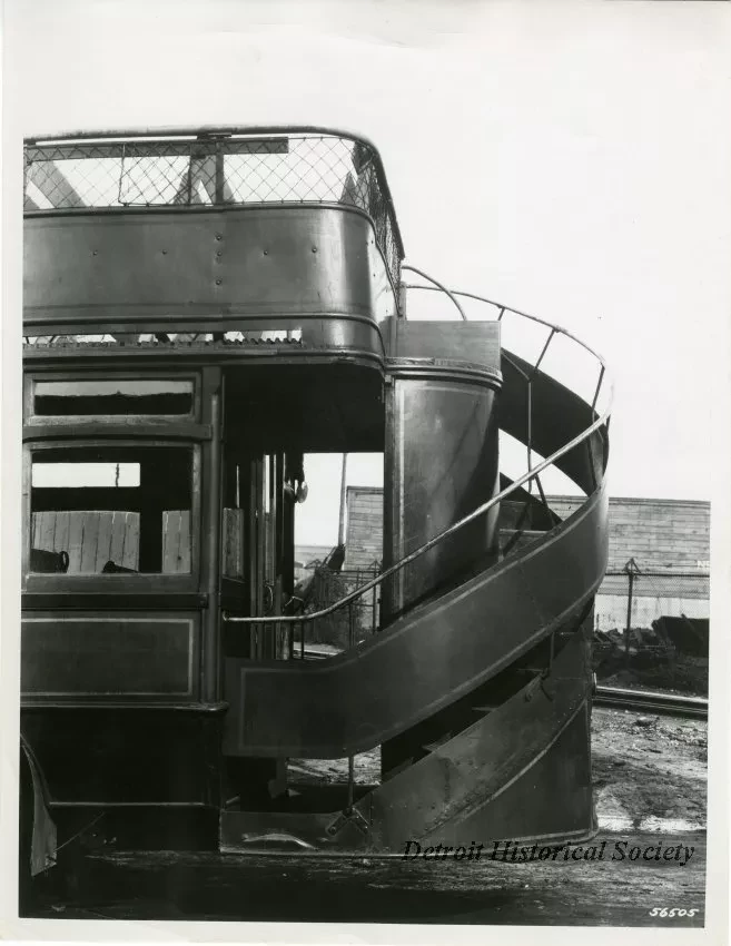 Black and white photo of the rear left side of the double-decker Detroit Motorbus Company bus, number 707. A pile of railroad rails, and a chainlink fence are in the background. "56505," is printed in the lower right corner.
