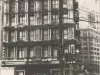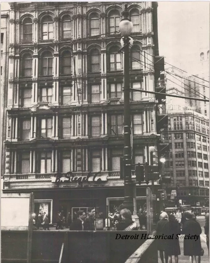 Black and white photo showing the B. Siegel Co. clothing store at the southwest corner of Woodward Avenue and State Street. In the foreground are several pedestrians. In the background is the Capitol Park Building.