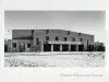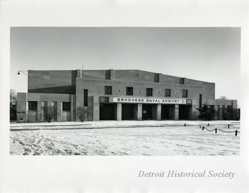 Black and white photograph depicting the Brodhead Naval Armory at 7600 E. Jefferson Avenue, looking south. Text sculpted into the top of the building reads "The Best Defense of a Democracy is a Well Trained Citizenry." Underneath is a sign with the building's name, to the left of which is a sign reading "U.S. Marine Reserve" and to the right of which is a sign reading "U.S. Navy Reserve." Snow is visible on the ground.