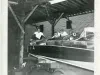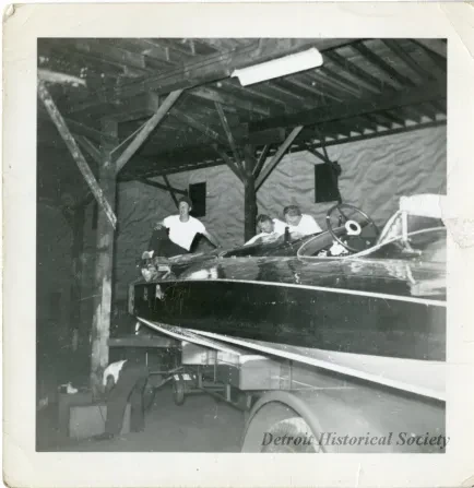 Sepia-toned photo of the nose of the hydroplane, likely the MISS CANADA IV, atop a trailer inside a shed with wooden beams, as taken off of its port side, looking toward its bow. A man with his leg up, perches at the boat's bow, while two men on its starboard side look into its engine compartment. At the lower left, a man on the ground leans over several boxes. A Prince Edward Yacht Club burgee is painted on the side of the hydroplane.