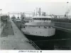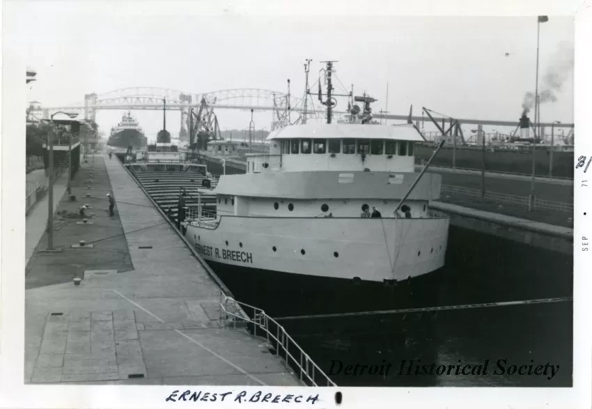 Black and white photo of the Ford Motor Company Marine Division freighter ERNEST R. BREECH in the Soo Locks' MacArthur Lock, as taken from the shore off of its starboard bow after it has been lowered. Workers stand by bollards to which the freighter is tied along the shore. Another freighter--presumably the PAUL H. CARNAHAN--waits behind it to enter the lock. The Sault Ste. Marie International Bridge is in the background. A third freighter--presumably the PERCIVAL ROBERTS, JR.--is in the Poe Lock on the right. A handwritten note is on the verso: