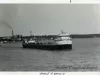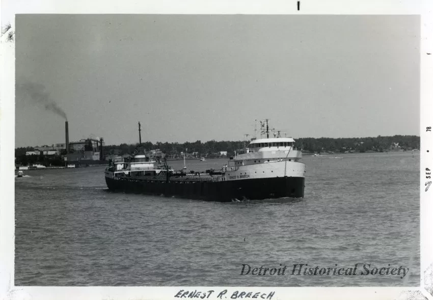 Black and white photo of the Ford Motor Company Marine Division freighter ERNEST R. BREECH on the St. Clair River, as taken off of its port bow. A factory is on the shore in the background. A handwritten note is on the verso: