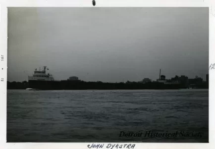 Black and white photo of the Ford Motor Company Marine Division freighter JOHN DYKSTRA on the Detroit River, as taken off of its port side with Windsor in the background. A handwritten note is on the verso:
