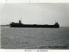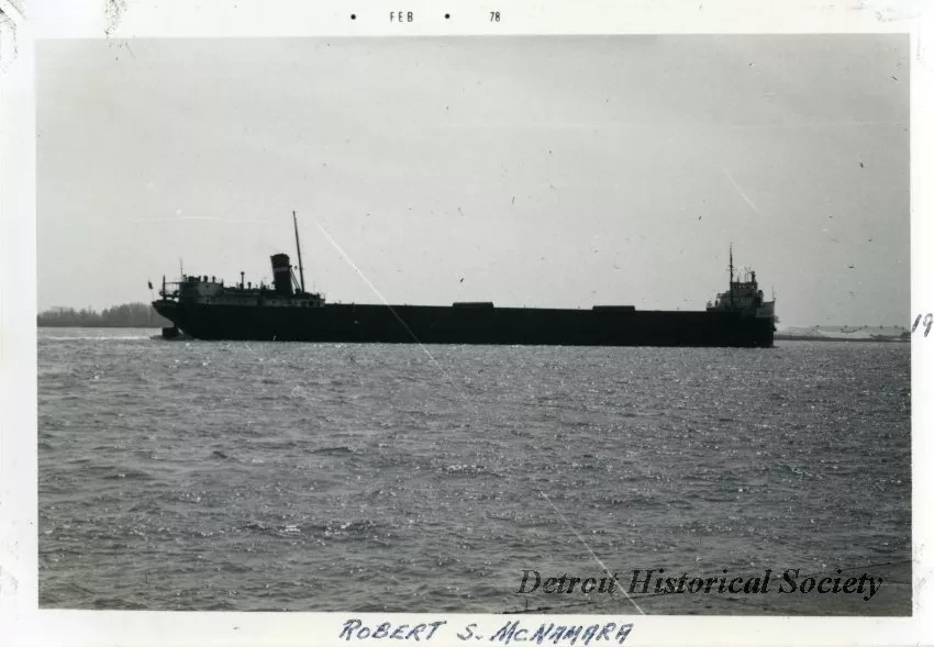 Black and white photo of the Ford Motor Company Marine Division freighter ROBERT S. MCNAMARA on the Detroit River as taken off of its starboard side toward its stern. Salt is piled on the shore in the background. A handwritten note is on the verso: