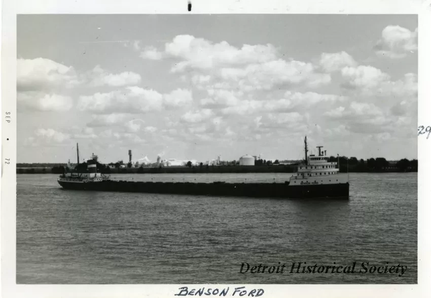 Black and white photo of the Ford Motor Company Marine Division freighter BENSON FORD on the St. Clair River, as taken off of its starboard side. An industrial complex, presumably part of Sarnia's "Chemical Valley" is on the shore in the background. A handwritten note is on the verso: