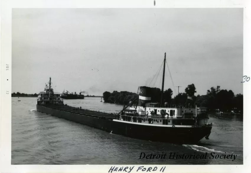 Black and white photo of the Ford Motor Company Marine Division freighter HENRY FORD II on the St. Clair River, as taken from an elevated position off of its port quarter. Several figures, including one who's waving, stand outside the freighter's aft cabin. The river bends around a tree-lined shore on the right side of the frame. The Columbia Transportation Company freighter ROBERT C. NORTON approaches from around the bend. A handwritten note is on the verso: