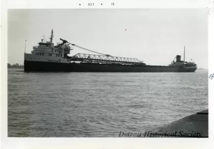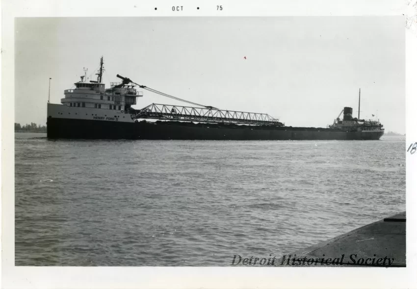 Black and white photo of the Ford Motor Company Marine Division freighter HENRY FORD II on the Detroit River, as taken off of its port side toward the bow, after its 1974 conversion to a self-unloader. A concrete ledge is along the shore in the foreground. A handwritten note is on the verso: