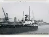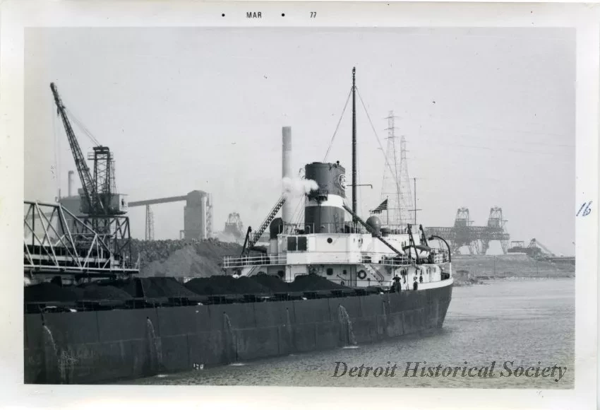 Black and white close-up photo of the Ford Motor Company Marine Division freighter HENRY FORD II's aft cabin as taken as taken off of its port side from a point near the Jefferson Avenue bridge over the Rouge River as it passed. Steam pours out from its whistle. Coal is piled on board above the level of its decks. A figure stands on deck near a door of the aft cabin. Zug Island is visible in the background. A handwritten note is on the verso: