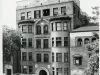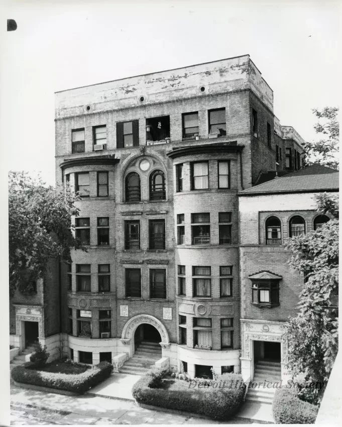 Black and white photographic print depicting an elevated view of the Verona Apartments on the north side of Ferry Street at Cass Avenue.