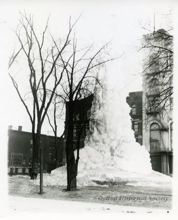 Black and white photographic print depicting the ice fountain in the median of Washington Boulevard. In the background is the Cadillac Hotel.