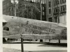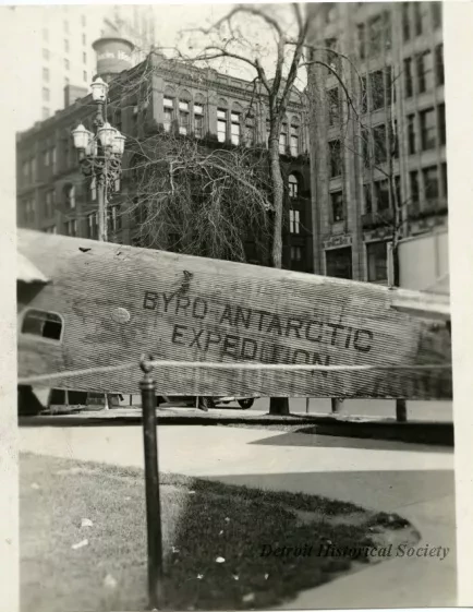 Black and white photographic print depicting a Ford Trimotor called the FLOYD BENNETT on display on Washington Boulevard. It was used by Richard E. Byrd on his 1929 Antarctic expedition. In the background are the Michigan State Telephone Building and Empire Building on the east side of the boulevard at Clifford Street.