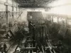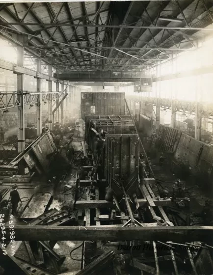 Sepia-toned photograph taken to document the effort to set a new record time for boat construction through the manufacture of Eagle Boat No. 59. Workers work on the keel, which now has the upper framing and more bulkheads are now in place, within building "B" of the Ford River Rouge Factory Complex. The time of photo is 9:30 am. Lower left hand corner show number and date of photo: 26295-04-02-19 with a #59 and 9:30 am written above. Photo mounted on a linen backing.