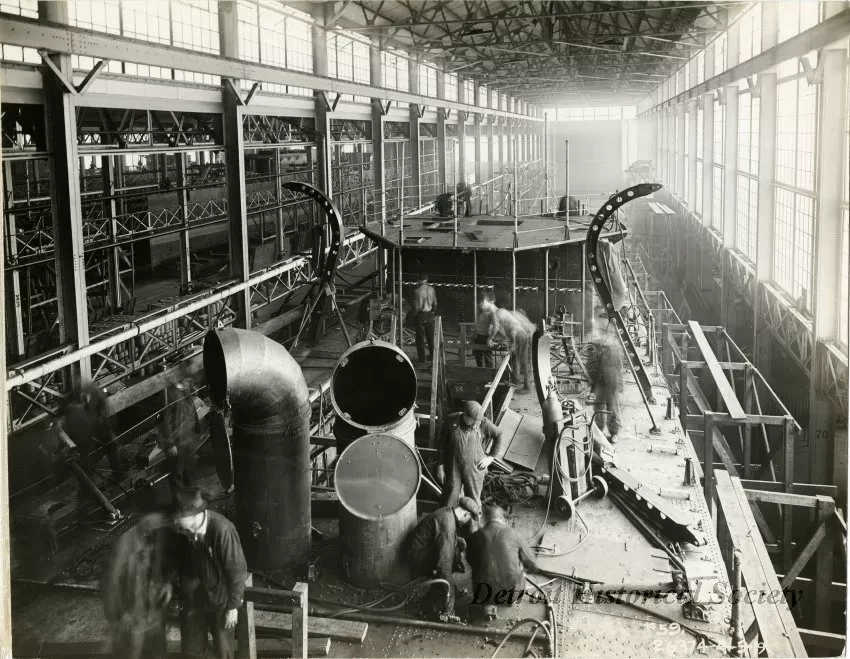 Sepia-toned photograph taken to document the effort to set a new record time for boat construction through the manufacture of Eagle Boat No. 59, within building "B" of the Ford River Rouge Factory Complex, of workers installing the boat's deck fixtures as viewed from about its starboard quarter, facing toward the bow. Cowl vents, davits, and some of the cabin structure are in place. "#59, 26374-04-07-19," is printed in the lower right corner of the recto and "8A15," is handwritten on the verso. The photo is mounted on a linen backing.