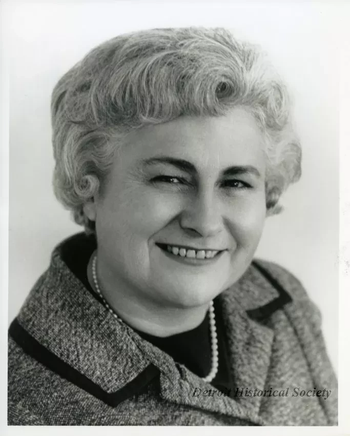 Request ImageBlack and white portrait of Olga Madar. She wears a pearl necklace and is smiling.