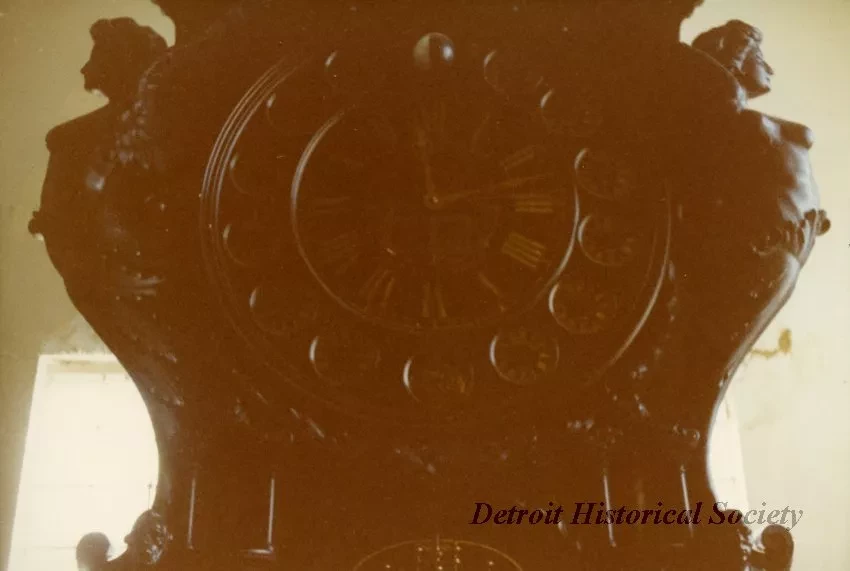 Color photograph of the face of the Meier clock, showing the center dial and all the smaller dials around it, as well as the moon phase above the main dial. The carvings on either side of the face are visible as well.