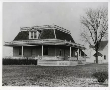 Black and white photograph of the Square House, the second home of Henry and Clara Ford. This photograph shows a square wooden house with wrap-around porch. There is cresting on the roof at both the top and bottom. A covered well sits in the background behind a tree.