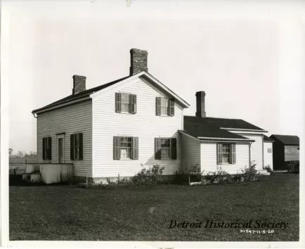 Black and white photograph of Moore House, Henry and Clara Ford's first home. This picture is taken from a side angle, the front of the house is visible as well as the side and a wooden barn in the back of the house. Two steps lead up the very small wooden porch at the front entrance of the house. The house has three chimneys, shutters at each window and a farm field in the background of the house. From the front the house appears to have only one story but from the side a second floor of windows is apparent.