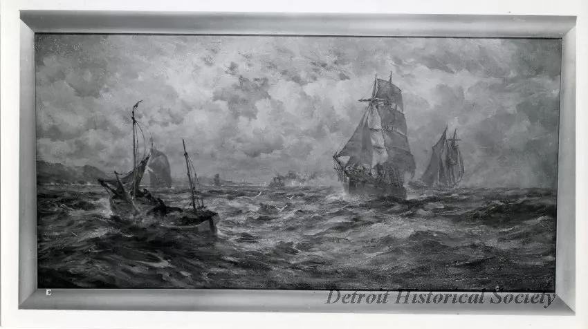 Photo of the framed Robert Hopkin painting "Sailing Vessels Off Sande Light." This painting shows four ships, three clearly. The closest ship is quite small, with just one mast, and its sail not fully up, directed toward the left side of the painting. The next closest ship has two masts and is directed toward the viewer. Three seagulls fly in between these two ships. A third ship can be seen clearly toward the back right behind the second ship.
