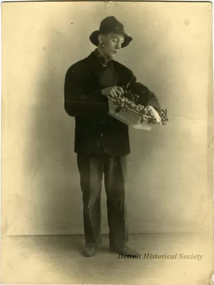 Sepia photograph of quick-change artist Paul Homann dressed in one of his costumes--a coat, scarf, and hat, with one earring visible as his is turned to the side. Homann is looking down at a basket he is holding of what look like grapes.