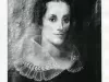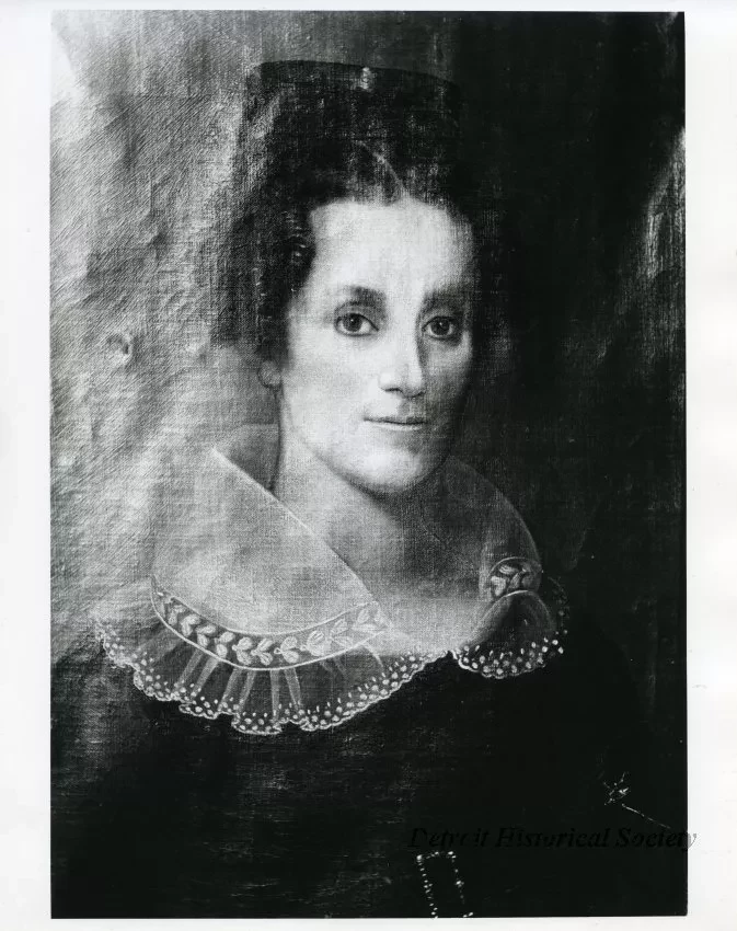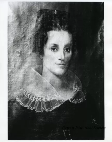 Black and white photograph of a c. 1825 bust portrait painting of Sylvia [Colt] Larned by Abraham Tuthill. She is depicted wearing a dress with a shiny buckle, a sheer, lace collar. Her hair is pulled back and up, in what looks like curls.