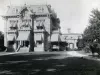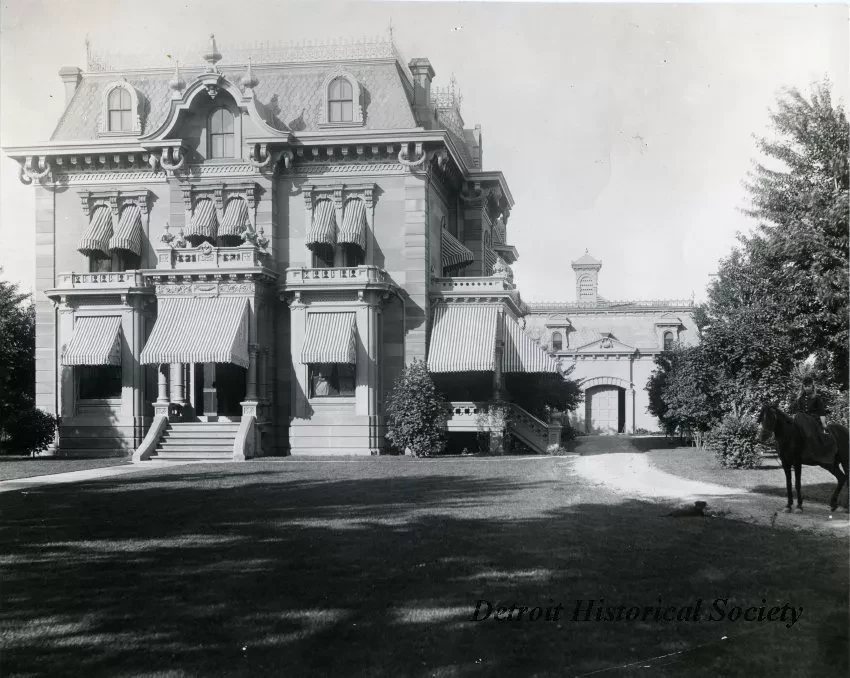 Black and white photograph of the exterior of the Pingree home on Woodward Avenue between Warren Avenue and Farnsworth Street. The building is a three-story house, with a mansard roof. Striped awnings are over the windows and doorway. Three decorative finials sit on a gable that frames the center window on the third floor. A young girl, possibly Hazel Pingree, poses on horseback on thee right edge of the frame.