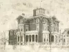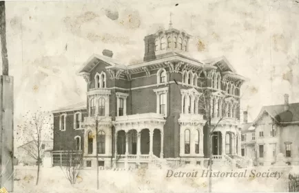 Large black and white photograph of the exterior of Cyrenius Adelbert Newcomb' s home at 625 Woodward Avenue. Snow covers the ground.