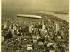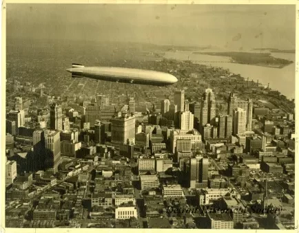 Black and white photograph showing the Graf Zeppelin flying over Detroit on October 26, 1933. The photograph was taken by William Kuenzel for the Detroit News from an airplane at an altitude of 1200 ft. In view are the downtown skyline, looking east, with the Detroit River and Belle Isle in the background.