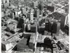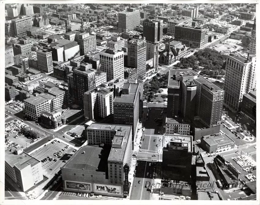 Black and white photograph showing an aerial view--presumably shot from Book Tower--along Bagley Avenue, looking northeast toward Grand Circus Park from above Grand River Avenue. On the left side of the street are the Michigan Theatre, United Artists Theatre Building, and Hotel Tuller. On the right side are the Michigan Consolidated Gas Co., AAA, and Hotel Statler. Buildings around the park include David Whitney Building, Y.M.C.A., Central United Methodist Church, Fyfe Building, Stroh Building, Kales Building, and Hotel Briggs. In the background are the Hotel Wolverine, Y.W.C.A., and Fox Theatre. On the left side of the image are the Young Women's Home Association at the corner of Clifford and W Adams Streets, and buildings along Park Avenue.
