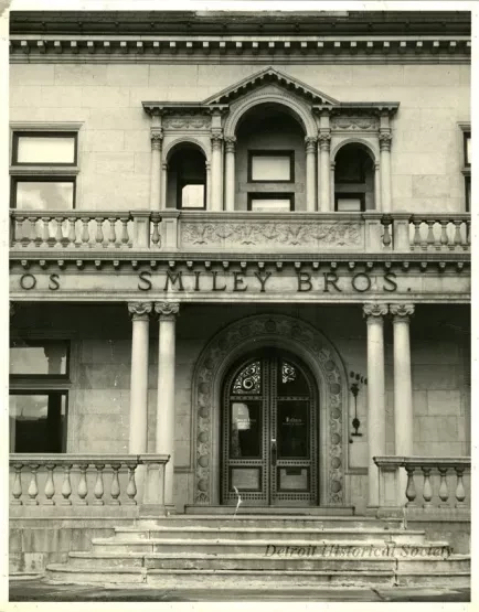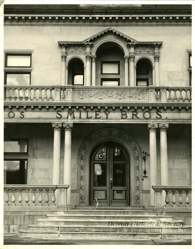 Black and white photograph showing the front entrance of the Col. Frank J. Hecker House, located at 5510 Woodward Avenue. The photograph was taken when the house served as the location for the Smiley Bros. Music Company. Text on the left window of the door reads "Smiley Bros. Music Co." Text on the right window of the door reads "Baldwin Pianos & Organs."