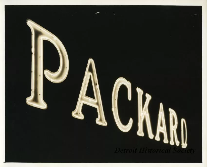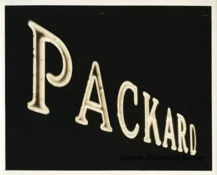 Click to enlarge 2013.095.124 Print, Photographic Black and white photographic print of a large "PACKARD" neon sign. Date c. 1930 Collection Packard Motor Car Co. Print Size 8" x 10" Search Terms Neon Signs, Neon, Signs Media Please help us improve our collection by providing information about this image. Use the "Send Feedback" link above to email us. Request Image
