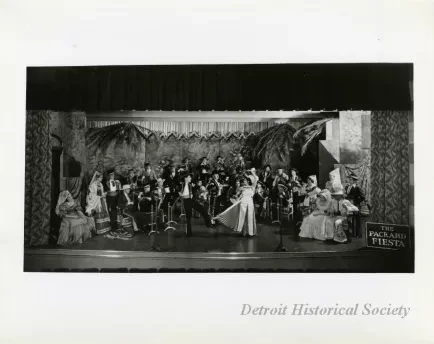 Request ImageBlack and white photograph of a production on The Packard Fiesta show on radio station KFI in Los Angeles.
