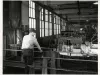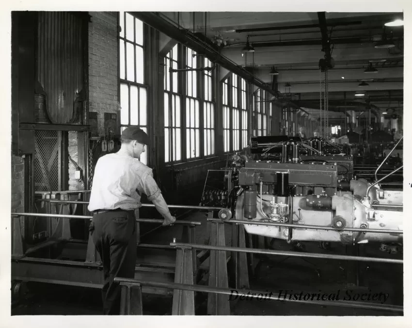 Request ImageBlack and white photograph of a man, facing away from the camera, looking at machinery inside a Packard Motor Car Co. factory.