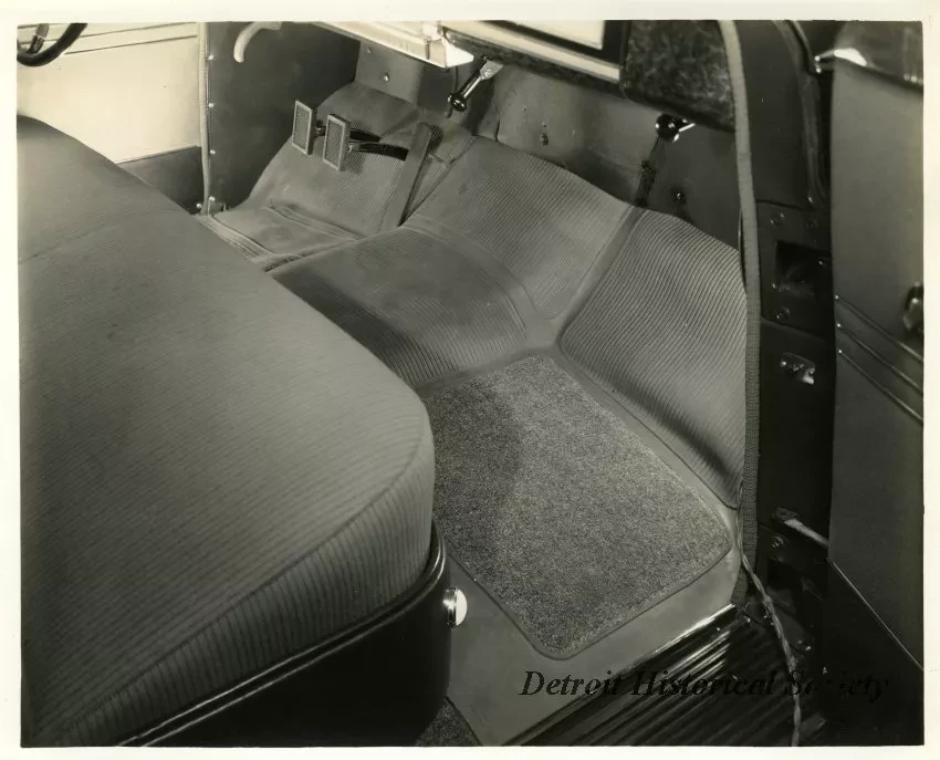 Request ImageBlack and white photograph of the front interior of a Packard Motor Car Co. automobile, taken through the open front right door and showing the Packard's floor.