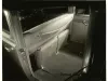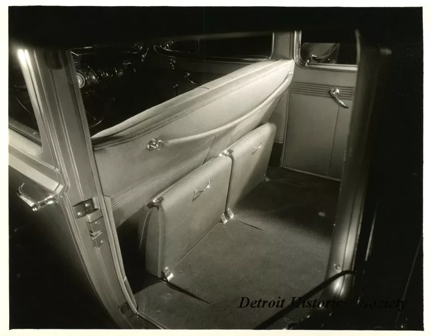 Black and white photograph of the interior of a seven passenger Packard Super Eight, showing the back of the front seat, stowed away additional seating, and a portion of the dashboard. The photograph was taken through the open back left door and is angled toward the front right of the automobile.