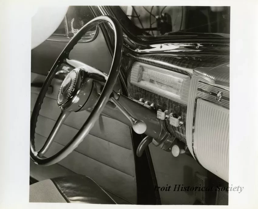 Request ImageBlack and white photograph of a close up shot of the left side of the dashboard of a Packard Motor Car Co. automobile.