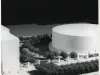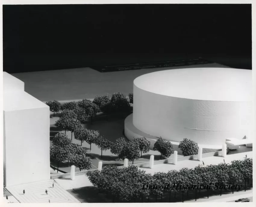 Black and white photographic print depicting a detail of an architectural model of a proposed design for Civic Center Plaza. It shows the area between Cobo Arena and the Veterans Memorial Building, looking south.