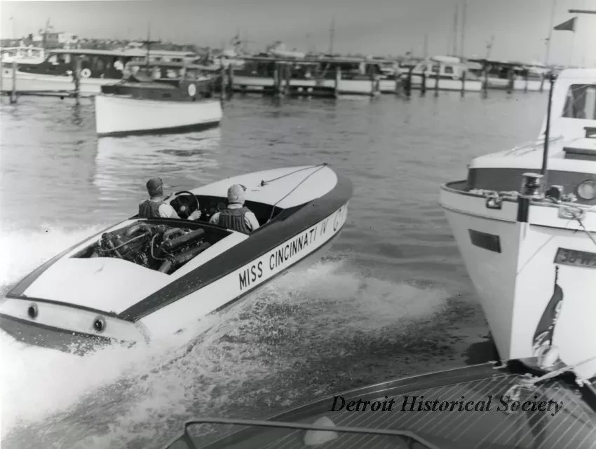 Black and white photo of hydroplane, MISS CINCINNATI IV, leaving the harbor.
