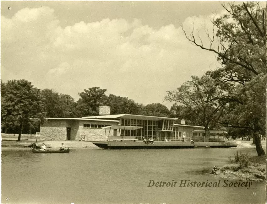 Sepia-toned photo of the exterior of the Flynn Pavilion on Belle Isle, as taken from across Lake Tacoma to the southwest. A woman and man row a canoe on the lake on the left, and several other people sit or stand on the pavilion's platform.