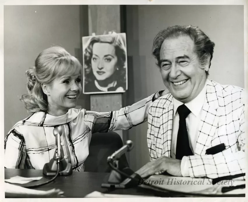 One black and white glossy photograph of singer, Debbie Reynolds, and Bill Kennedy. Both are well-dressed and are seated behind an interview desk with two microphones and notes. A photographic image of Bette Davis is taped to a column in the background.