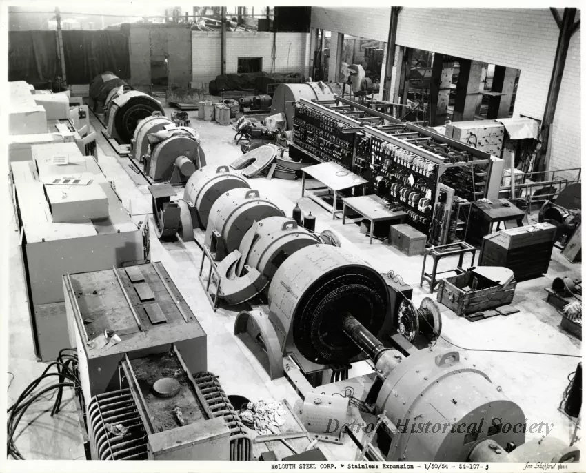One black and white photograph showing the interior of a factory building at McLouth Steel Corporation. A room with motor generators and their control components is shown. Typed text along the bottom of the photograph reads "McLouth Steel Corp.---Stainless Expansion 1/30/54 54-107-3." Printed in the right corner: "Jim Shepperd Photo."