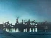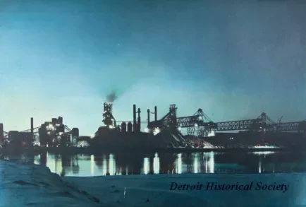 One color photograph showing a nighttime silhouette view of the McLouth Steel Corporation Trenton facility. Mounds of ore and coal can be seen on the dock in front of conveyor lines and furnaces. Smoke rises from a stack in the background. The image is reflected on the calm water surface of the ship channel in the foreground.