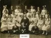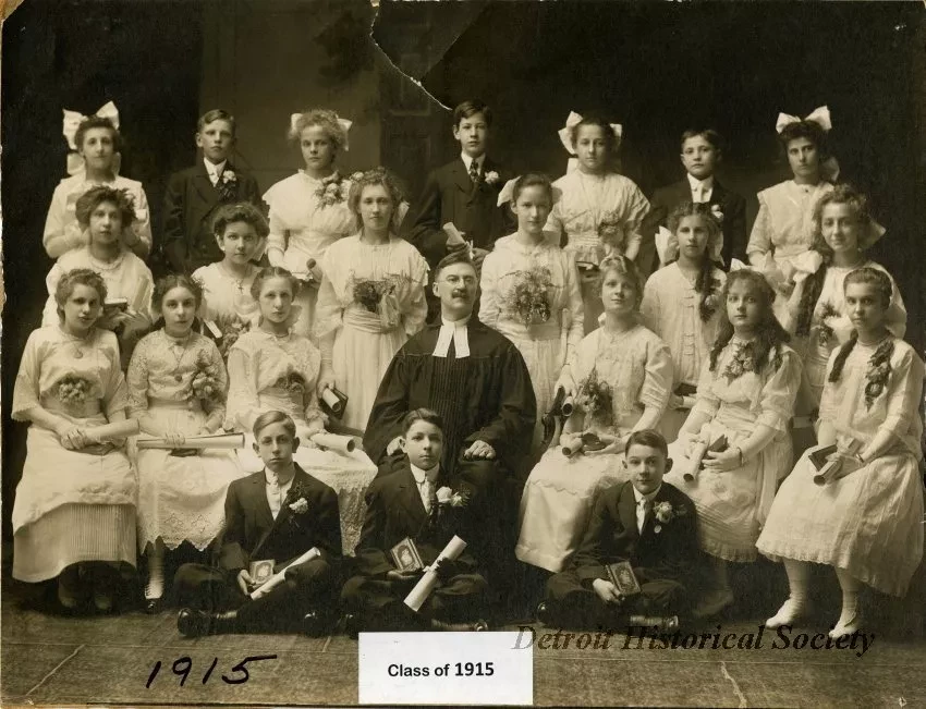 One sepia-toned photograph of the Confirmation "Class of 1915" at St. James Lutheran Church in Detroit. The photo shows four rows of older girls and boys who are seated or standing. Each is holding a Bible along with a certificate that is rolled up and tied with a ribbon. The girls are all wearing white dresses and the boys are wearing dark-colored suits. The pastor, Rev. August G. Bergener, is wearing a clerical robe and is seated at the center of the photo. A painted backdrop is visible in the background. Handwritten black ink text on the verso reads "Class of 1915 Confirmation, March 28, 1915," and "Given to St. James Lutheran Church from Gustav Albert Heyn."